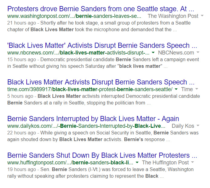 Let’s address this first. When I Googled “Bernie, Black Lives Matter” I got a list of articles that looked like this…