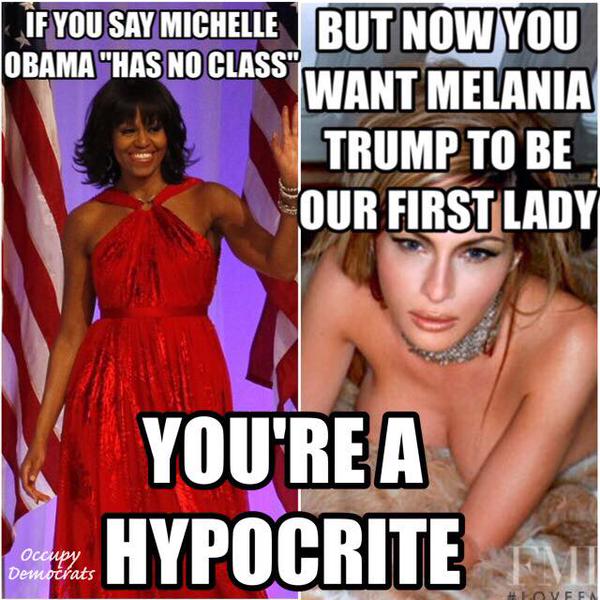 To be honest they could have used the same picture as the first meme to similar effect. I would point out, however, that Melania Trump is a super-model and it is her bread and butter to look super smokin’ hot, mostly so that we will feel compelled to buy things. That’s what super models do. They pose in pictures and those pictures are used to sell you on a standard of how women should look and usually also on a particular product. Melania’s body is her own and she gets to show it off or not, for money or not, as she sees fit. Does modeling as a profession come with some pretty big issues for a person who advocates gender equality? Yeah, you bet it does. Nevertheless, Melania Trump gets to make her own adult decisions about what to do with her body. The bigger point is, you do not need to slut-shame Melania Trump in order to elevate Michelle Obama. Michelle Obama doesn’t even need you to elevate her.
